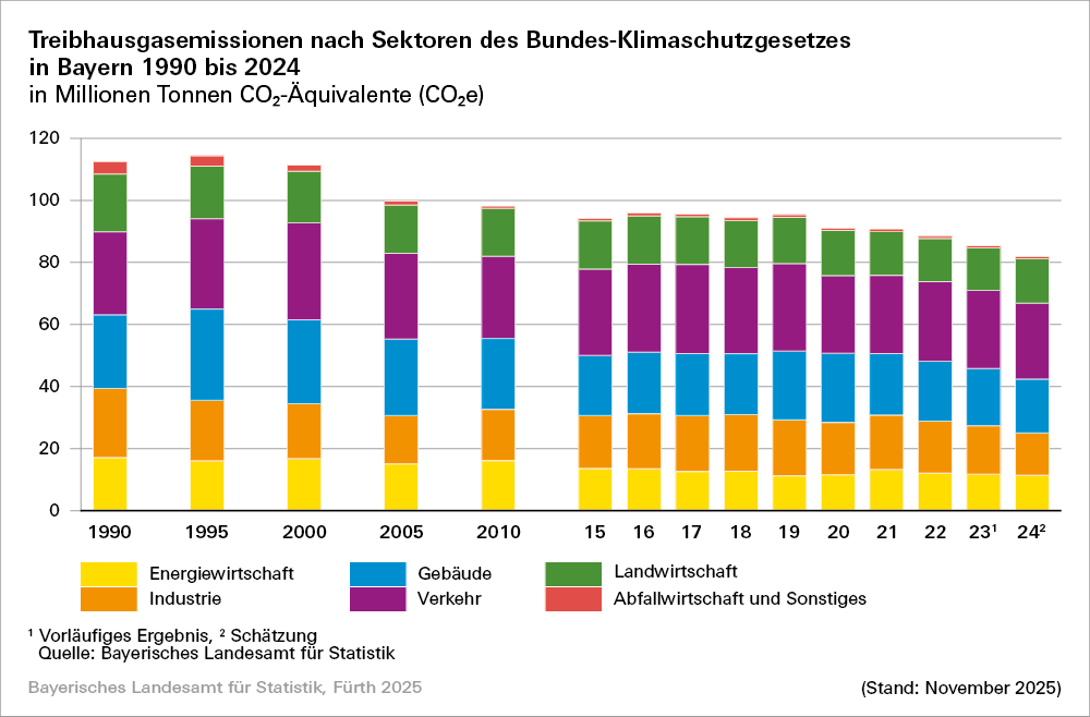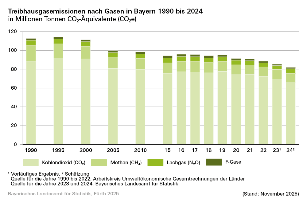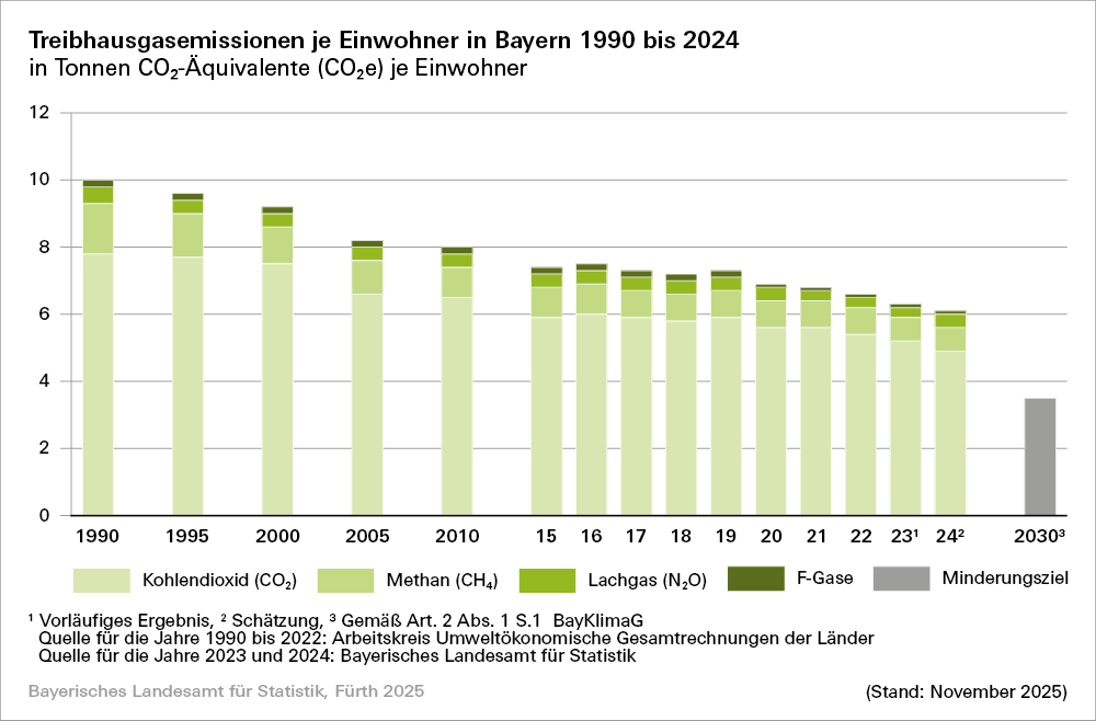 Angesichts des Klimawandels setzt sich der Freistaat Bayern mit dem Bayerischen Klimaschutzgesetz (BayKlimaG) das Ziel, bis zum Jahr 2030 die Treibhausgasemissionen je Einwohner im Vergleich zu 1990 um 65 % zu senken. Klimaneutralität soll im Jahr 2040 erreicht werden. Dem Monitoring von Treibhausgasen kommt in diesem Zusammenhang eine wichtige Bedeutung zu. Zu diesem Zweck berechnet das Bayerische Landesamt für Statistik für jüngere Berichtsjahre vorläufige Treibhausgasemissionen und erstellt Emissionsschätzungen.