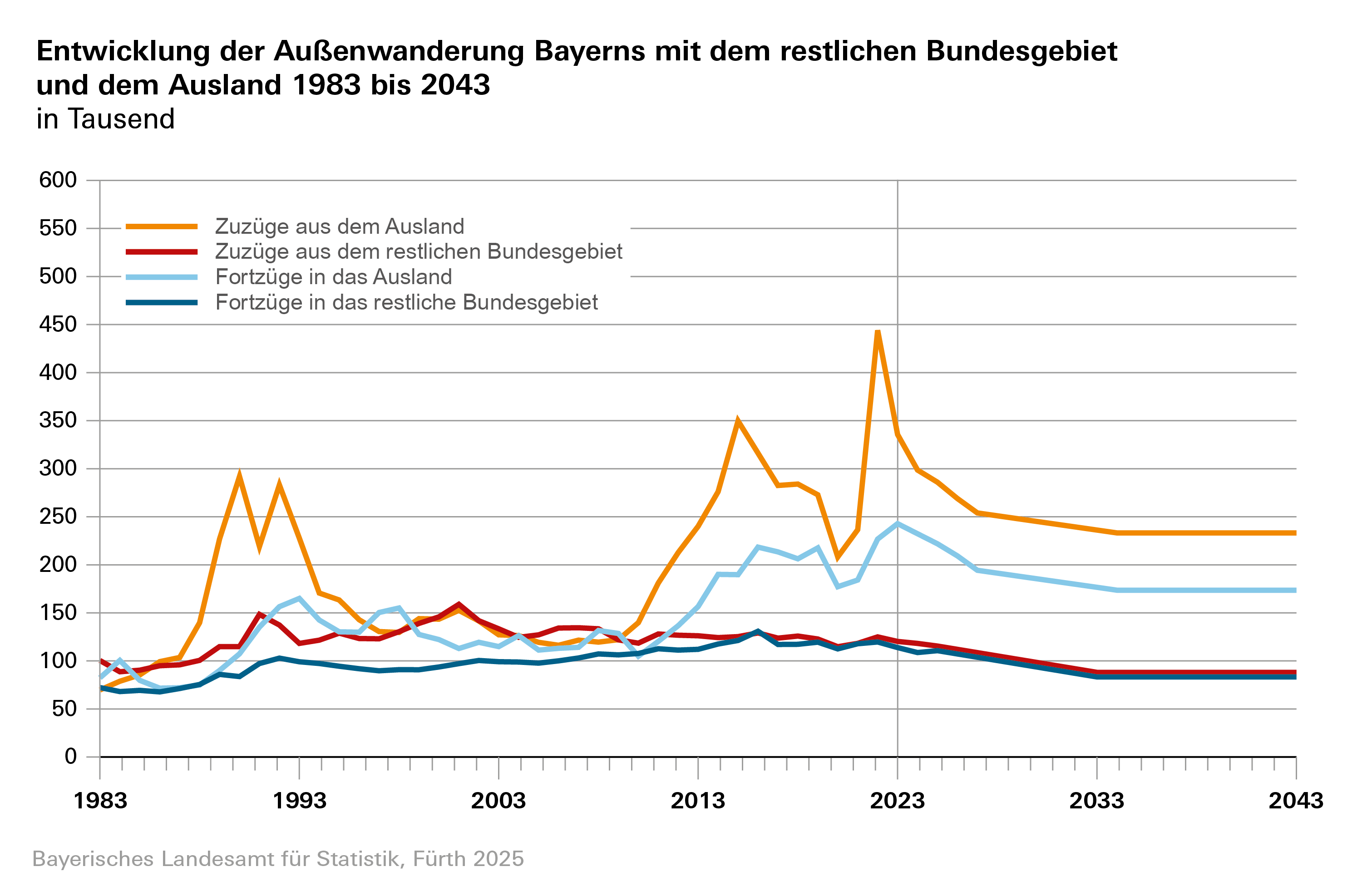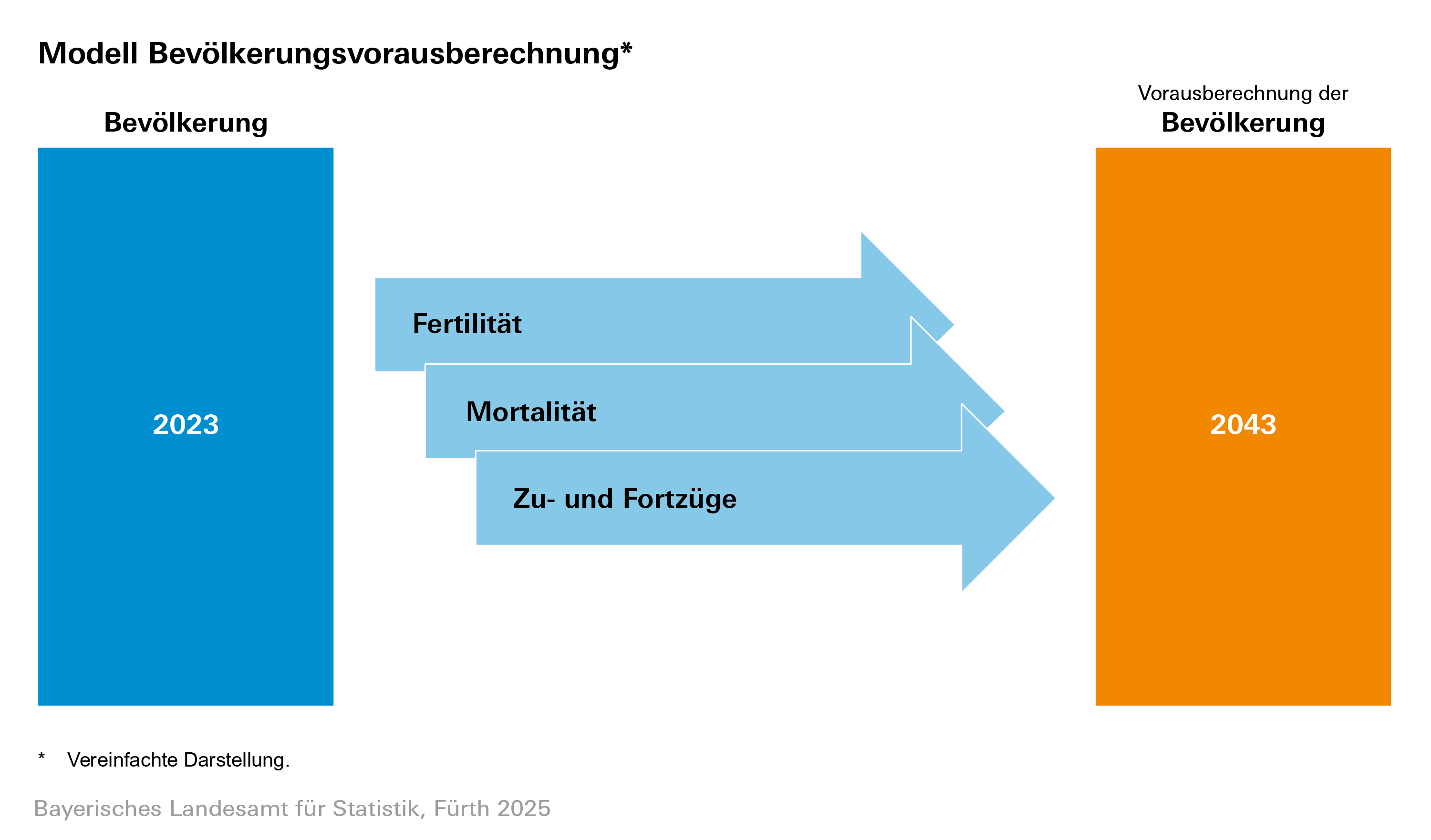 Die Regionalisierte Bevölkerungsvorausberechnung bis 2043 veranschaulicht mögliche Folgen des demographischen Wandels für Bayern. Die Zahl der Geburten wird demnach fast überall im Freistaat unterhalb der weiter ansteigenden Zahl der Sterbefälle bleiben. Aufgrund der natürlichen Bevölkerungsbewegung würde die Einwohnerzahl also künftig zurückgehen. Dennoch erwartet Bayern insgesamt durch die anhaltenden Wanderungsgewinne bis zum Jahr 2043 ein Bevölkerungswachstum.