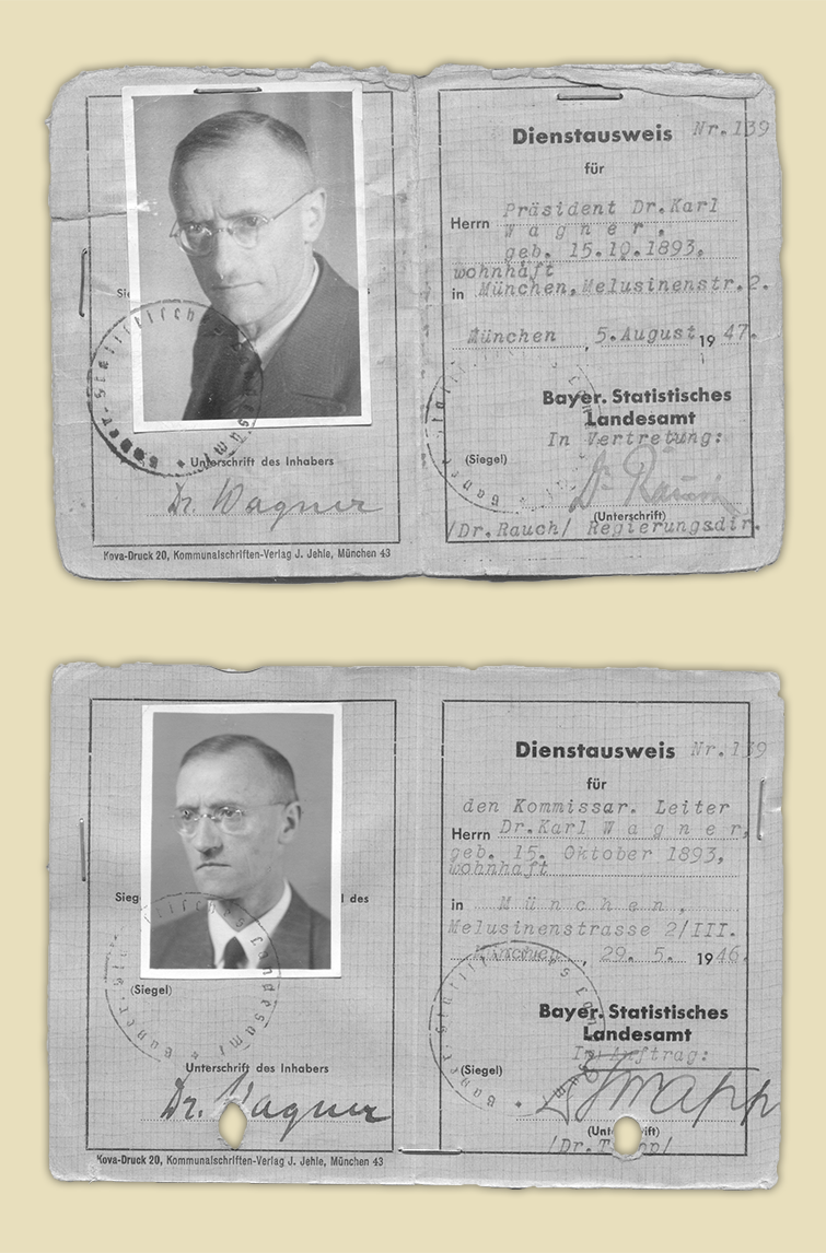 Dr. Karl Wagner (1893–1963) übernahm am 12. Februar 1946 die Leitung des Bayerischen Statistischen Landesamts, nachdem er während des Dritten Reichs aus politischen Gründen im Statistischen Reichsamt zwangspensioniert worden war. Seine Amtszeit dauerte bis 1960. Er prägte den Wiederaufbau der amtlichen Statistik in Bayern und darüber hinaus. Besonders wichtig war ihm eine systematische Beobachtung des Wirtschaftsgeschehens. Auf seine Initiative hin kam es 1948 zur Neugründung der Deutschen Statistischen Gesellschaft, deren Präsident er bis 1960 war.