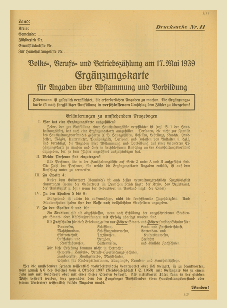 Die Besonderheit der Volkszählung 1939 war die „Ergänzungskarte“, auf der die Religion der Großeltern und die Ausbildung anzugeben war. Die Karten wurden zentral ausgewertet, die der Juden bis 1941 im Statistischen Reichsamt aufbewahrt und danach mit den Melderegistern abgeglichen.Die Volkszählungen von 1933 und vor allem von 1939 zeigen exemplarisch den Missbrauch der amtlichen Statistik durch das NS-Regime.