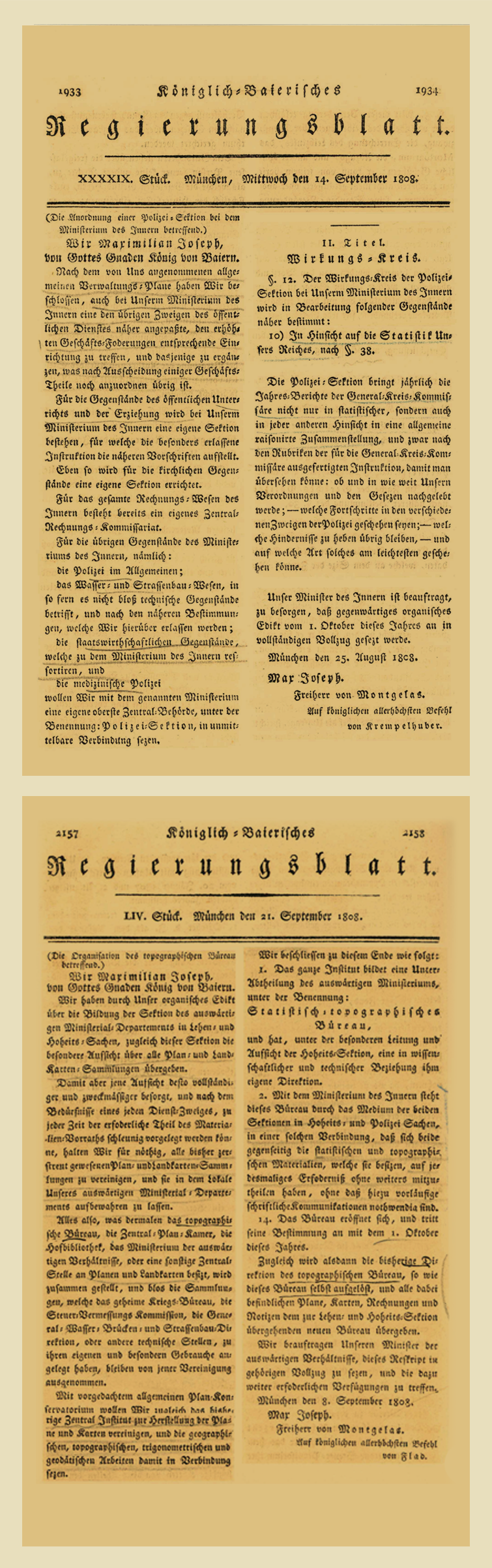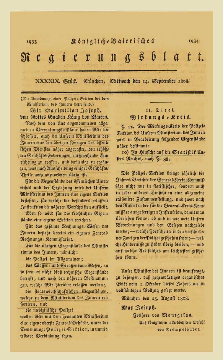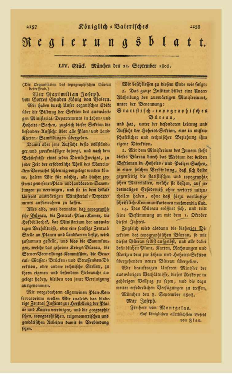 Im Außenministerium wird am 1. Oktober 1808 das Statistisch-topographische Bureau gegründet, im Innenministerium am selben Tag eine Polizei-Sektion, die sich ebenfalls mit Statistik befasst. Beide Einrichtungen sammeln die von lokalen Behörden gelieferten Daten und fassen sie zu einem gesamtbayerischen Ergebnis zusammen.1807 Johann Daniel Albrecht Hoeck (1763 - 1839) publiziert 1807 seine „Statistische Darstellung der Königlich-Baierischen Staaten“. 1806 Bayern wird Königreich. Gründung des Bayerischen Innenministeriums. Graf Montegelas (1759 - 1838) – bisher und weiterhin Außenminister – wird in Personalunion Innenminister, ab 1809 auch Finanzminister. Die Zeitschrift „Königlich Baierisches Regierungsblatt“ beginnt mit der Herausgabe von Statistiken. 1801 Gründung des Bureaus de Catastre (30.4.1801) und des Topographischen Bureaus aus der Commission des routes (19.6.1801). 1800 Gründung der „Commission des routes“, einer Unterabteilung des französischen statistischen Bureaus, im Schloß Nymphenburg durch General Decaen. Napoleon fordert eine „astronomisch und topographisch richtige Karte“ von Bayern.